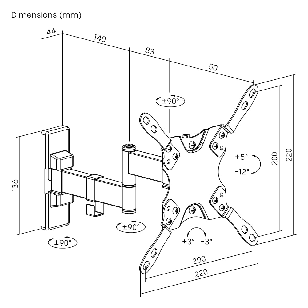 The TVB-102 is a full-motion wall mount for most 13''-42'' LED, LCD flat panel TVs up to 20Kgs/44lbs. It allows smooth, effortless tilt motion that makes it easy to reduce glare and find the perfect TV angle at any height. Full motion allow maximum flexibility extend, tilt and swivel your TV up to 273mm from the wall in every direction for easy viewing from any seat in a room. This pre-assembled arm comes complete with cable clips and decorative covers to ensure an elegant and tidy look. Its built-in level adjustment offers clockwise and counterclockwise turning to ensure it is perfectly level. It is compatible with VESA hole up to 200x200.