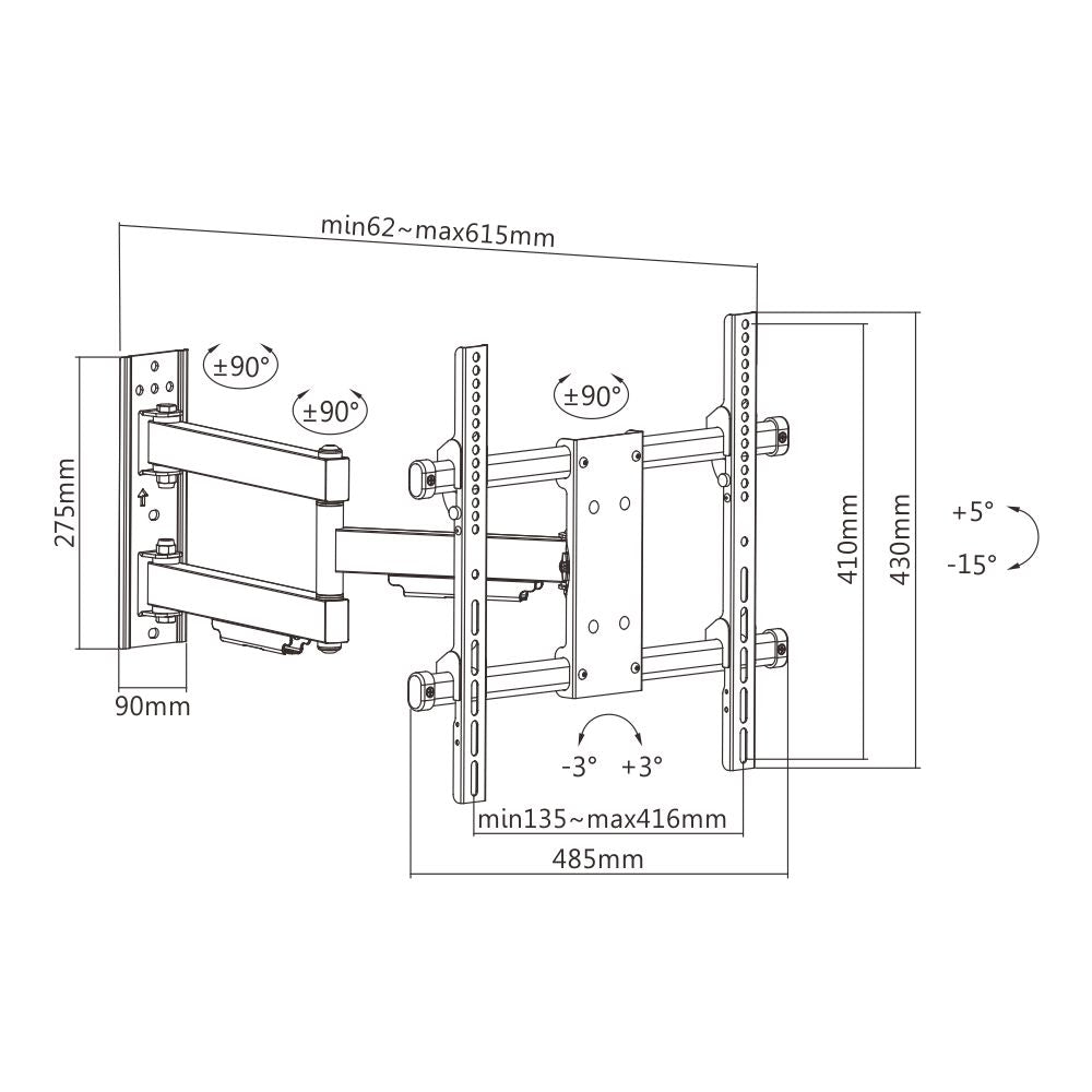 Il nuovo, solido supporto a movimento completo di grandi dimensioni è realizzato in acciaio ad alto spessore, progettato per la maggior parte dei televisori a schermo piatto da 32"-55"fino a 50 kg/110 libbre. Questo supporto consente di inclinare la TV a schermo piatto per controllare l'abbagliamento o ottenere un angolo di visione ottimale, estrarla dalla parete (estensione di 615 mm) e angolarla verso un'area di visualizzazione separata. Questo braccio preassemblato viene fornito completo di gestione dei cavi integrata e coperture decorative per garantire un aspetto elegante e ordinato.