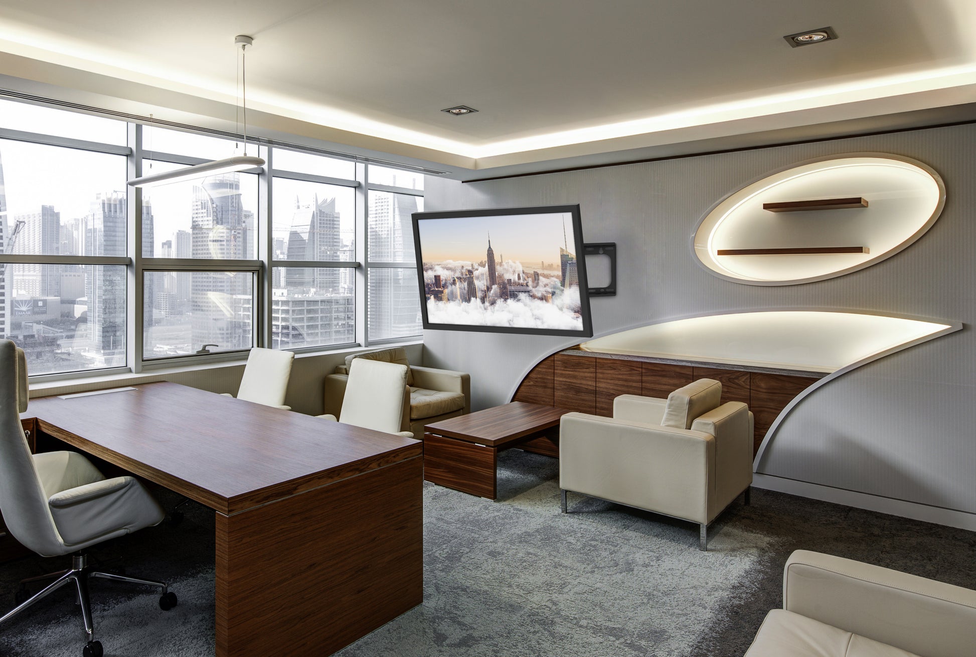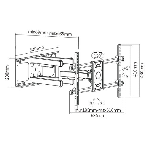 Il nuovo, solido supporto a movimento completo di grandi dimensioni è realizzato in acciaio ad alto spessore, progettato per la maggior parte dei televisori a schermo piatto da 37"-90"fino a 65 kg/143 libbre. Questo supporto consente di inclinare la TV a schermo piatto per controllare l'abbagliamento o ottenere un angolo di visione ottimale, estrarla dalla parete (estensione di 635 mm) e angolarla verso un'area di visualizzazione separata. Questo braccio preassemblato viene fornito completo di gestione dei cavi integrata e coperture decorative per garantire un aspetto elegante e ordinato.