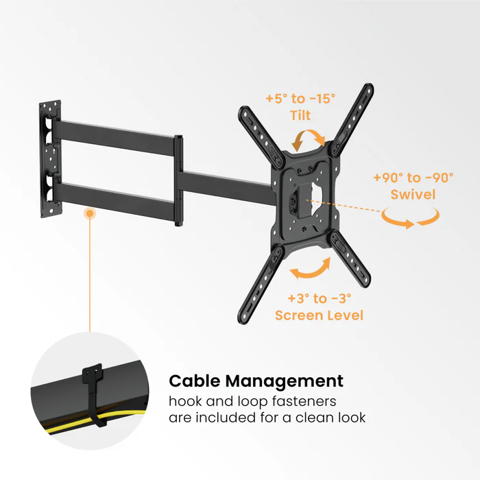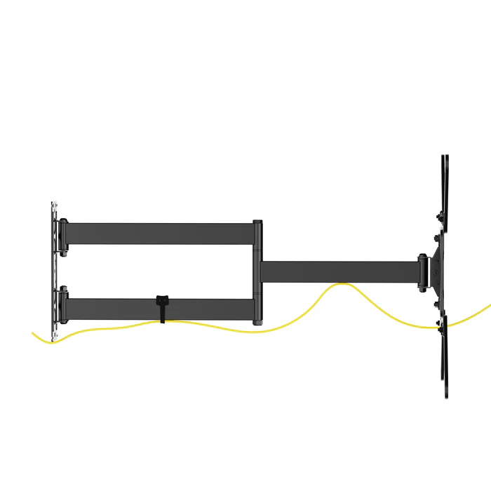 The bracket is of sturdy quality. However, it is important that the TV bracket is properly attached, precisely because the support arm is extra long. Clear mounting instructions are included and it is very important to follow them accurately. The smallest mounting error can cause the TV bracket to lose stability and hang crooked.